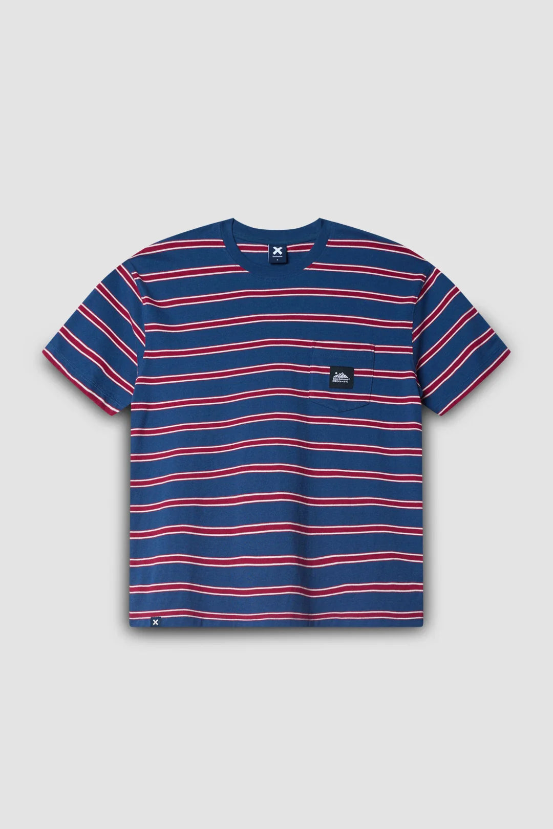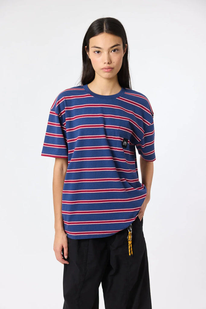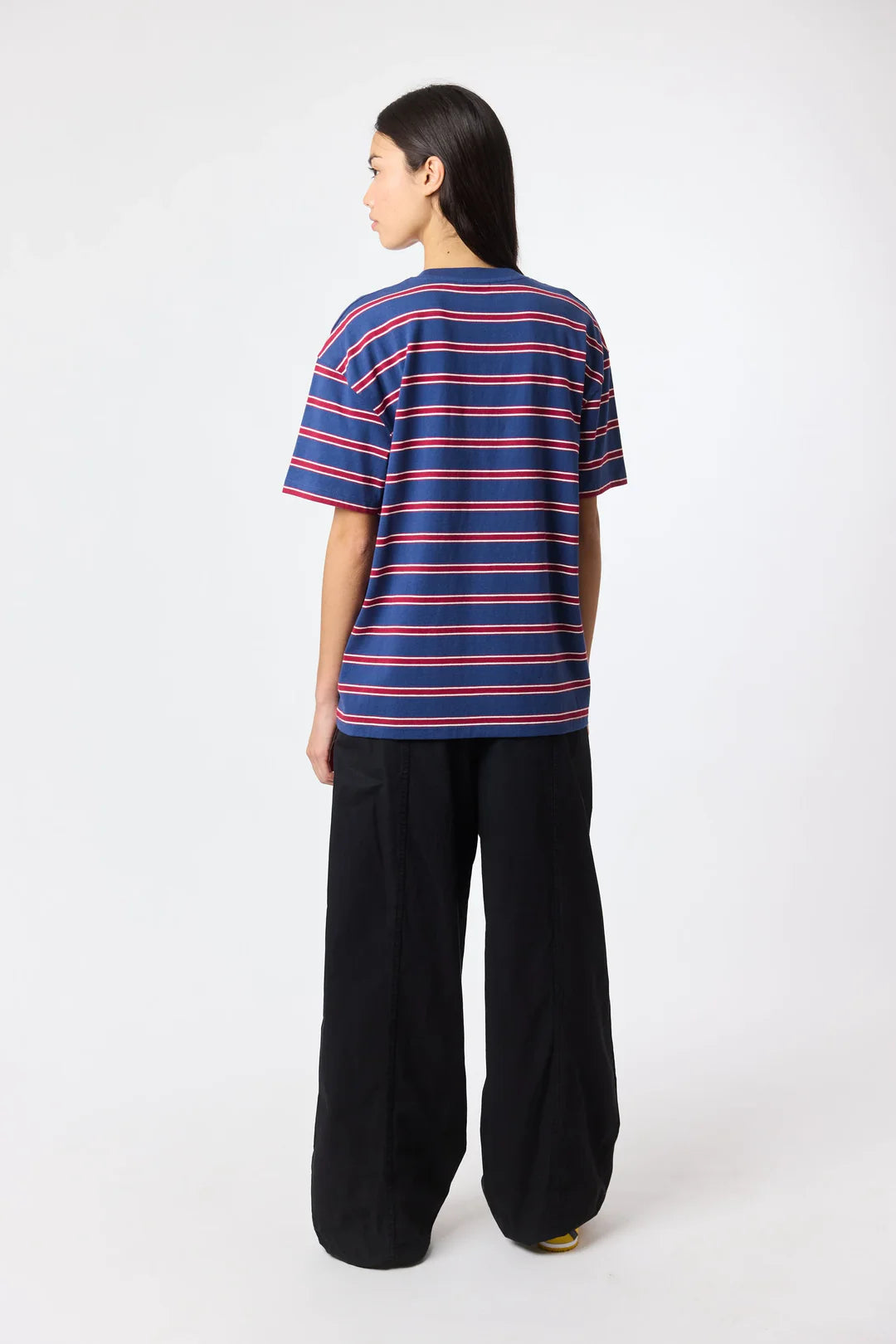 Camiseta a rayas con bordado delantero en la parte del pecho. Confeccionada con algodón 100% orgánico y corte oversize.