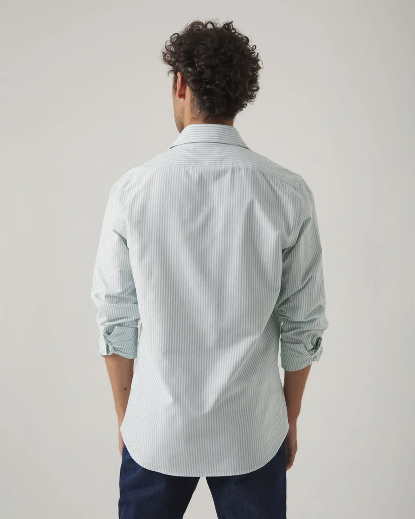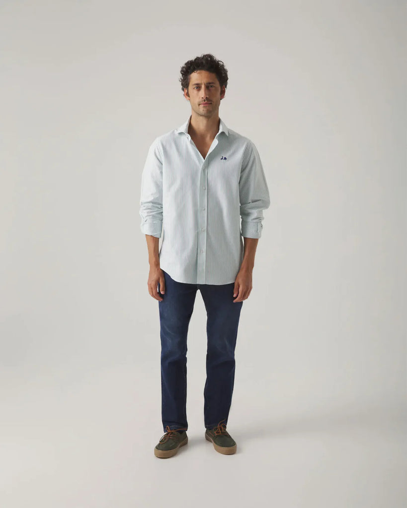 Camisa oxford de rayas verde, confeccionada en algodón con corte regular fit. Diseño de cuello italiano, manga larga con puño abotonado y cierre frontal con botones personalizados. Detalle de moto bordada en el torso. Camisa ideal para oficina o eventos informales.