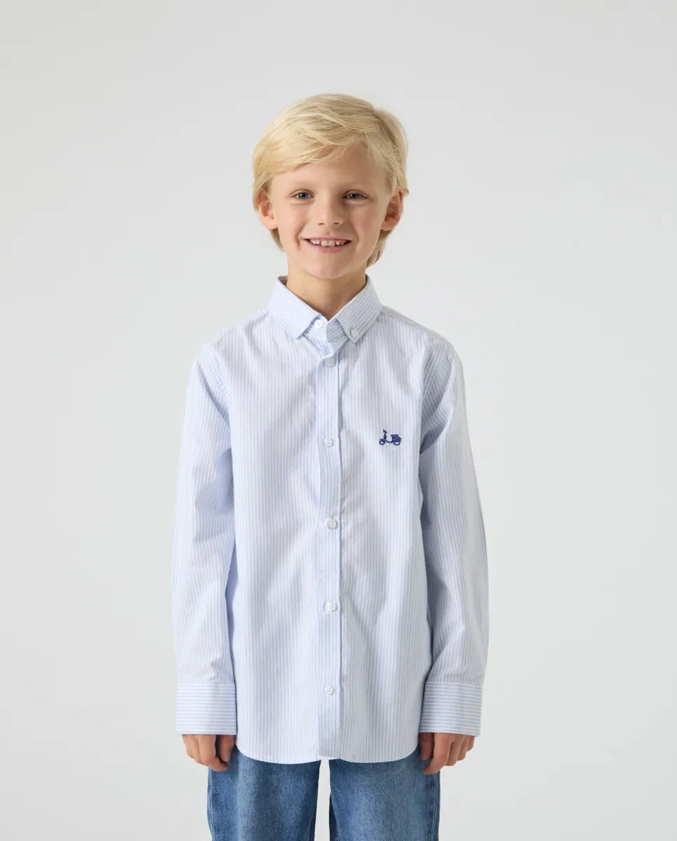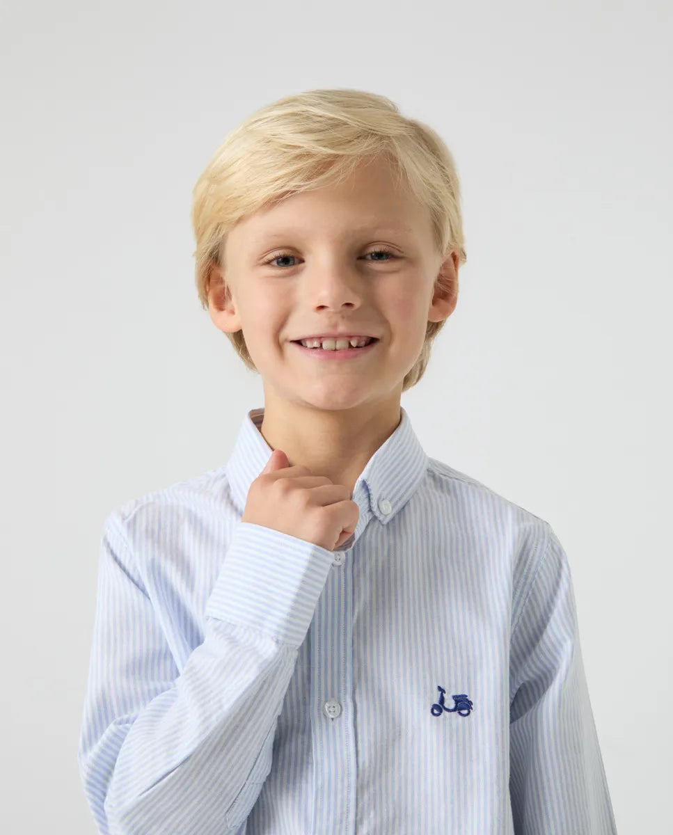Camisa de niño oxford de rayas azul confeccionada en algodón con corte regular fit. Cuello button-down, manga larga con puño abotonado y cierre frontal con botones personalizados. Detalle de moto bordada en el torso.