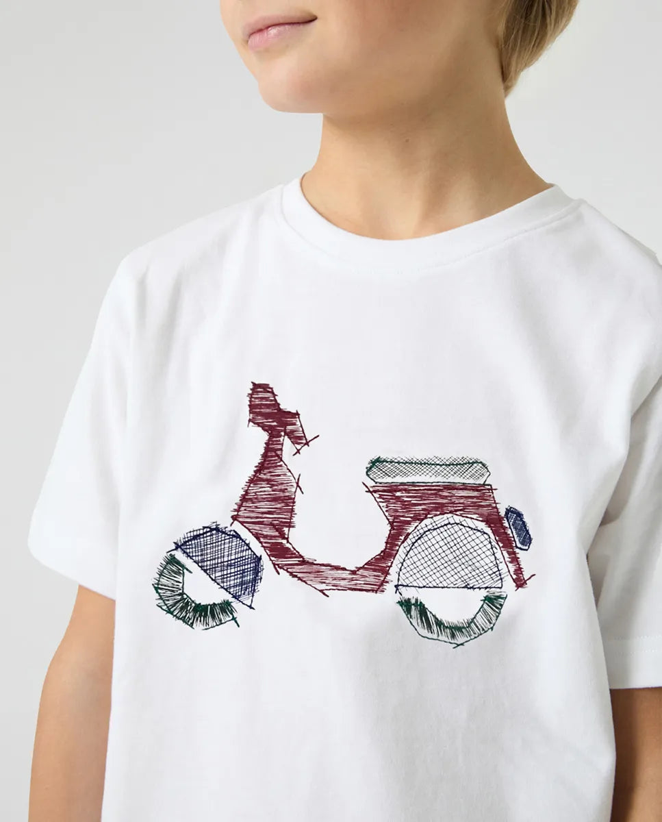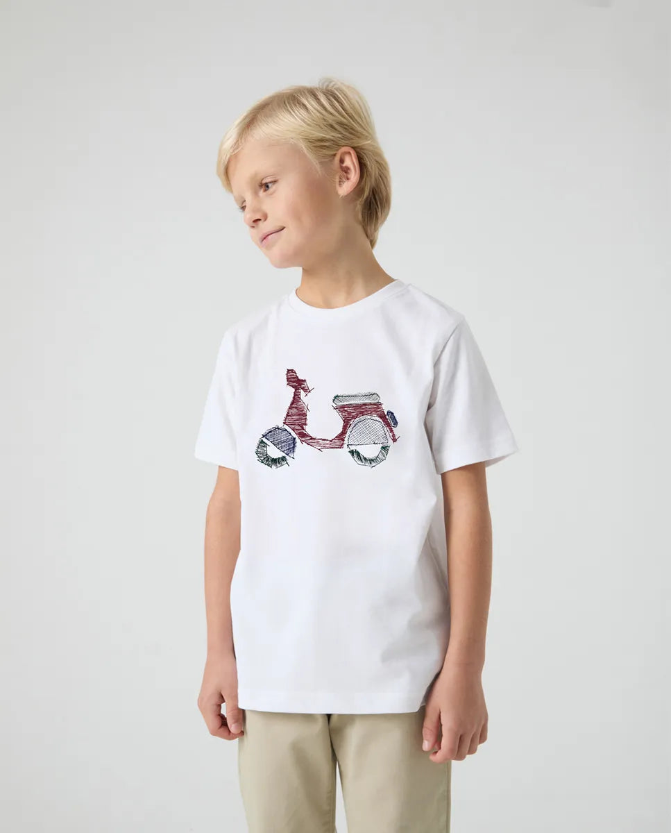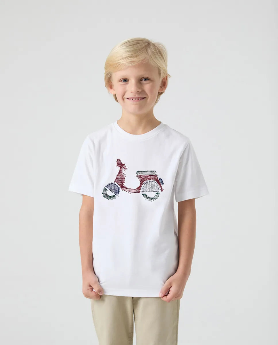 Camiseta blanca confeccionada en algodón con corte regular fit. Diseño de cuello redondo y manga corta, con detalle de moto con bordado en el torso. Tejido ligero y transpirable.