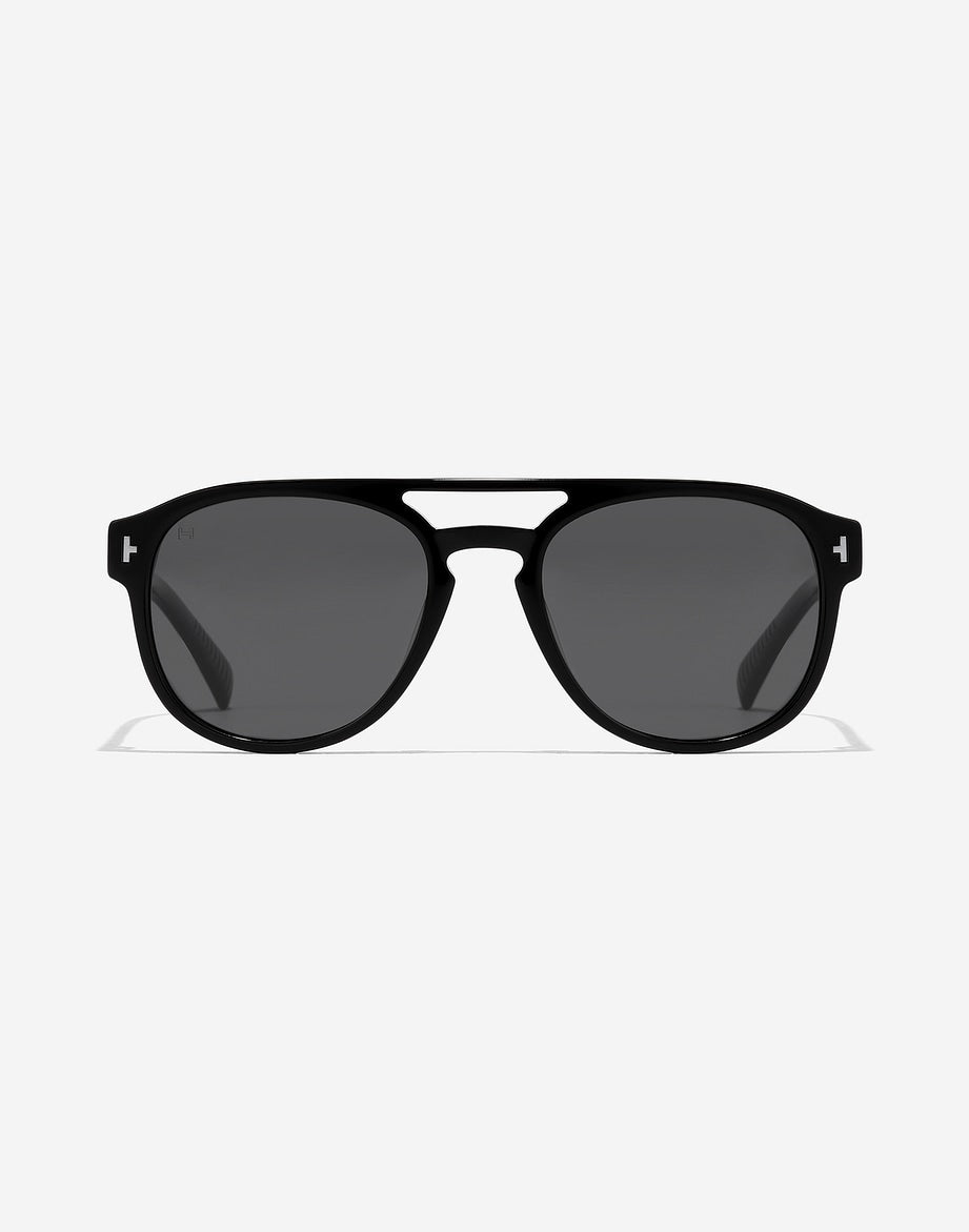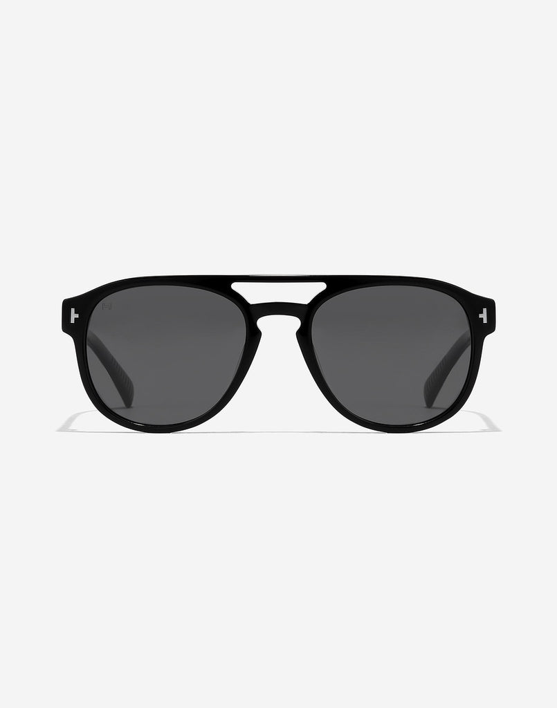 Gafas de sol total black de montura estilo aviador en acetato con acabado pulido, doble puente y pins ornamentales en forma de media H en ambos lados de su frontal, que le aportan un look más sofisticado al diseño.