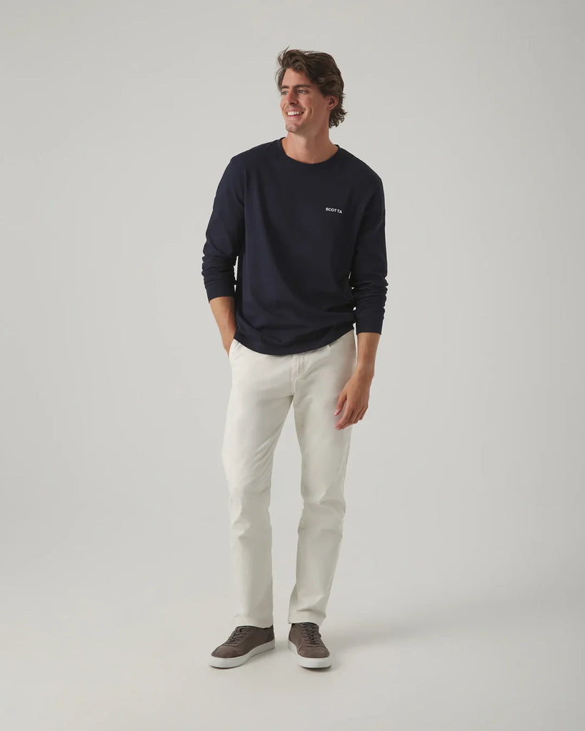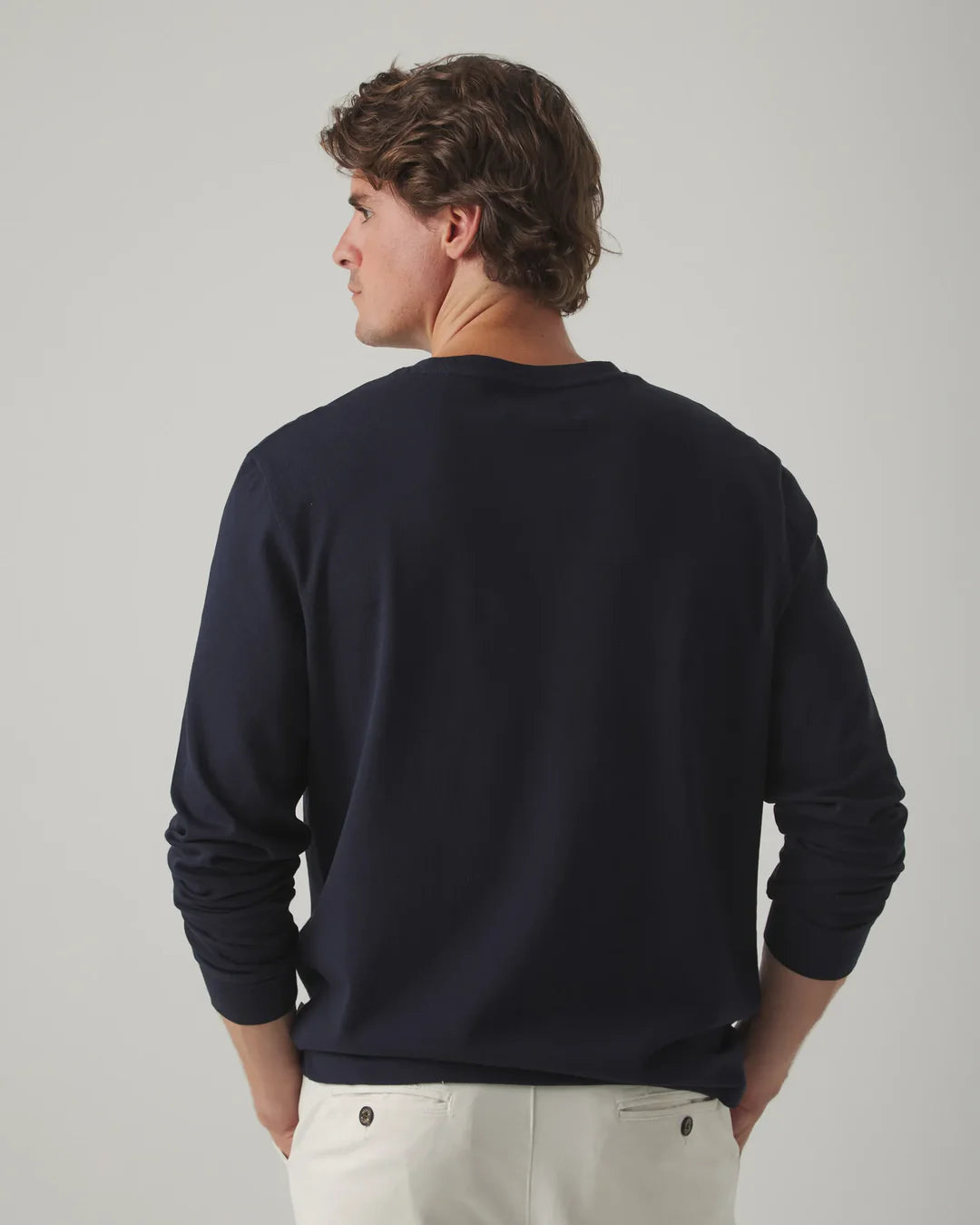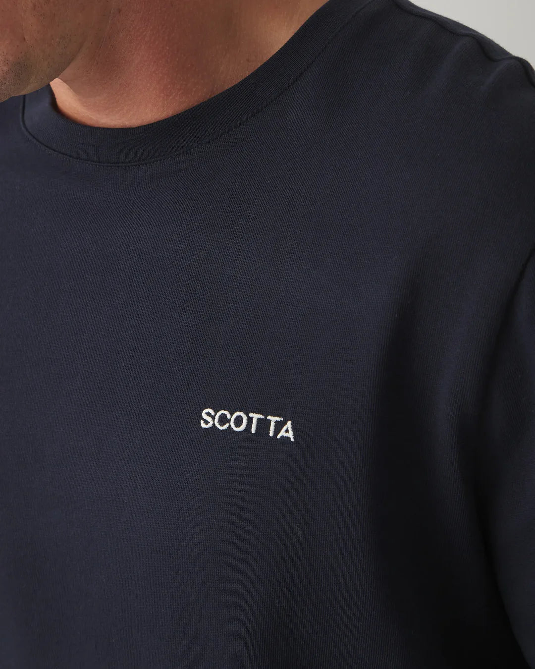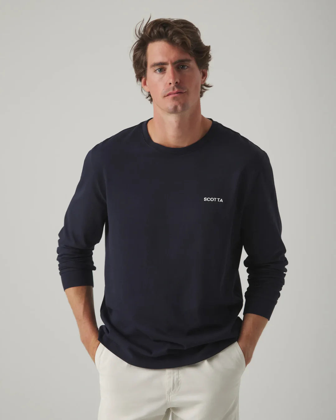 Camiseta en marino confeccionada en algodón con corte regular fit. Diseño de cuello redondo y manga larga, con letras Scotta en el torso. Tejido ligero y transpirable. Fabricada en Portugal.
