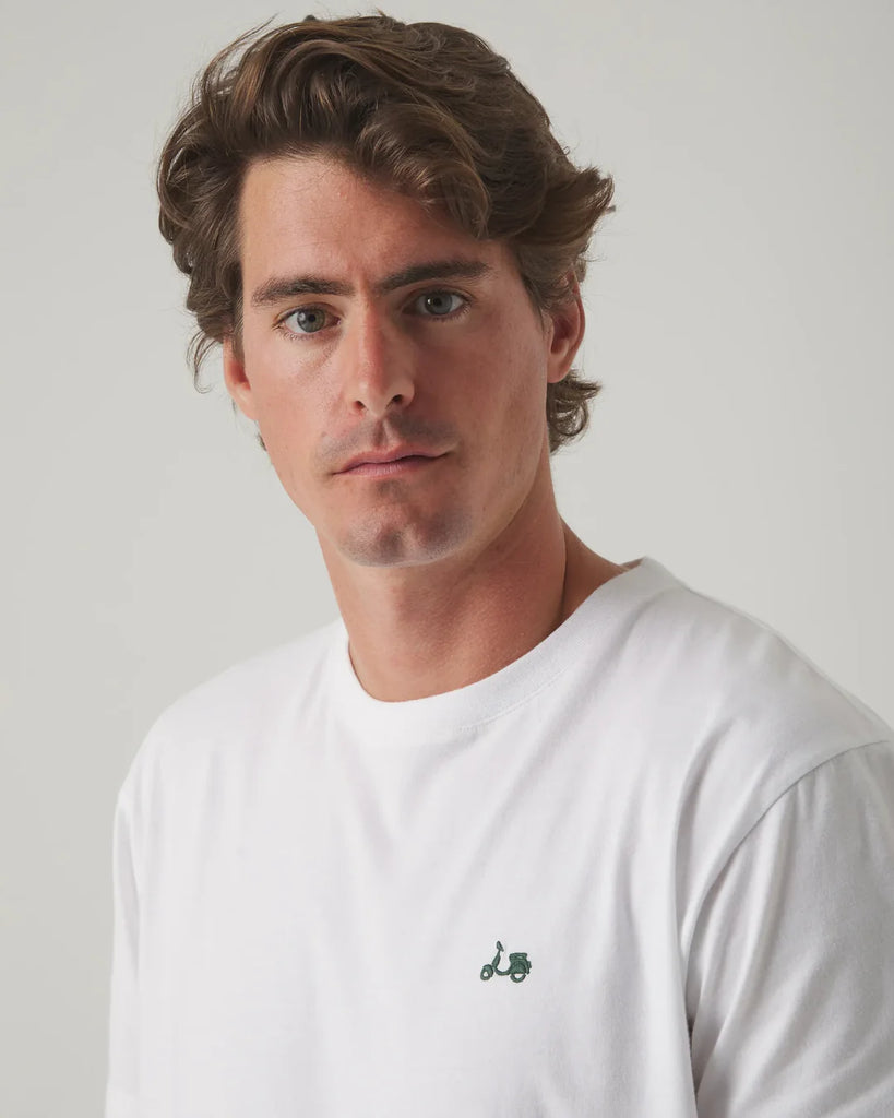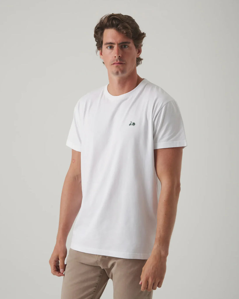 Camiseta en crudo confeccionada en algodón con corte regular fit. Diseño de cuello redondo y manga corta, con moto bordada en el torso y print en la espalda. Tejido ligero y transpirable. Fabricada en Portugal.