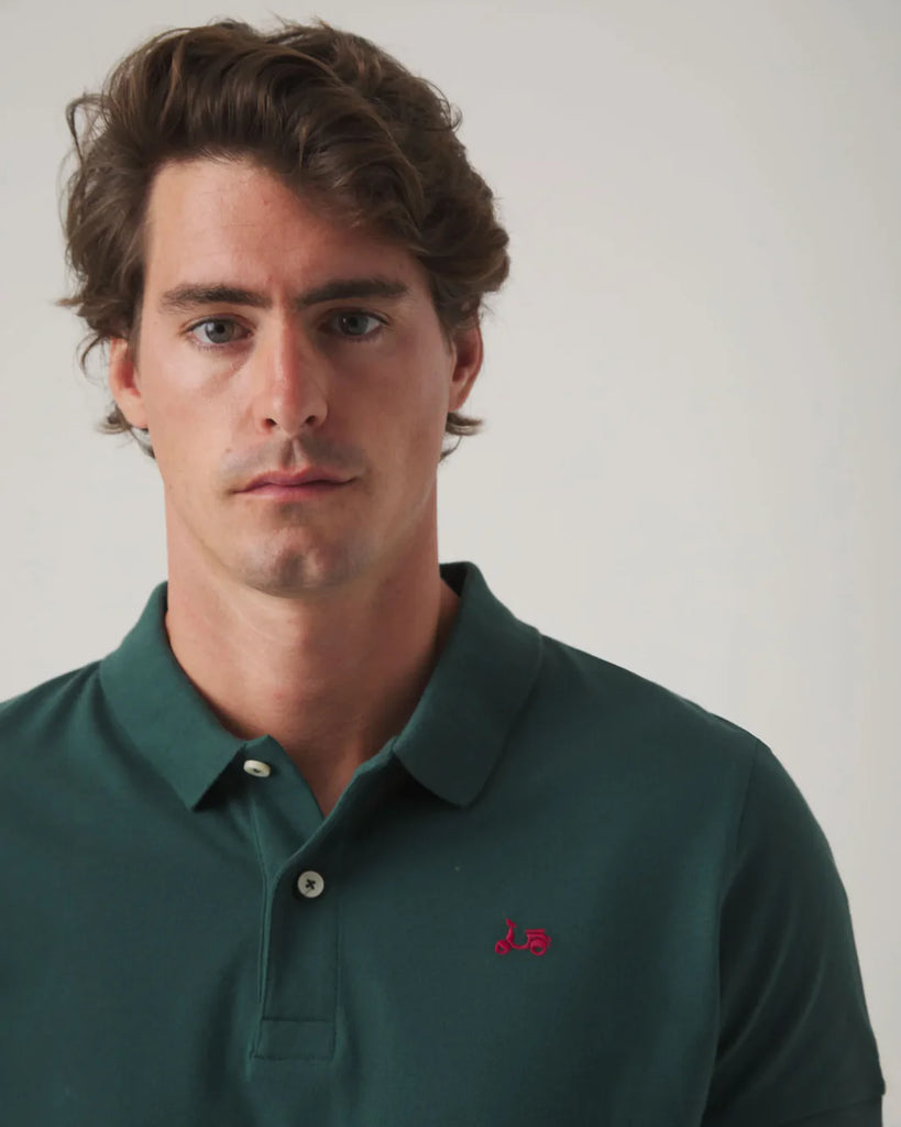 Polo clásico verde botella de corte regular fit, confeccionado en algodón. Diseño de cuello con cierre de botones personalizados y manga corta. Moto bordada a contraste en el torso. Fabricado en Portugal.