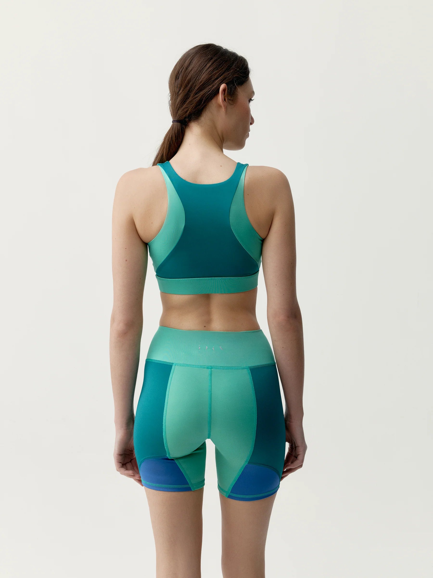 Sujetador deportivo tricolor de sujeción alta. Divertida combinación de tres colores de temporada en un práctico top de corte deportivo. Tejido Shapplex_B, compacto y ligero. Incluye copas extraíbles.